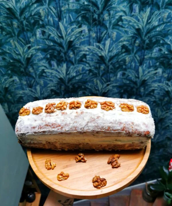 Composition: Carottes, Oeufs, Farine de Blé, sucre roux, huile de colza, noix, levure chimique, cannelle, beurre, creme cheese,